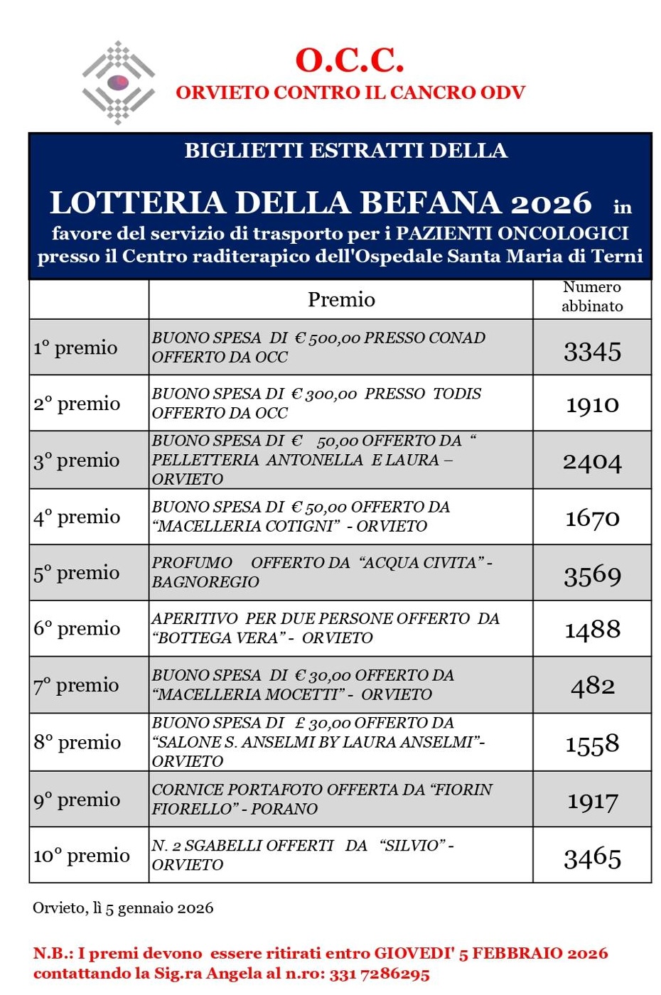 Di seguito i biglietti vincenti della Lotteria della Befana 2026, promossa da OCC – Orvieto Contro il Cancro OdV in favore del servizio di trasporto per i pazienti oncologici presso il Centro Radioterapia dell’Ospedale “Santa Maria” di Terni: